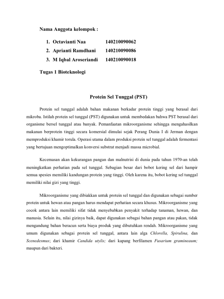 Makalah Protein Sel Tunggal from imgv2-2-f.scribdassets.com Protein sel tunggal adalah bahan makanan berkadar protein tinggi yang berasal dari mikroba. Chlorophyta (ganggang hijau)contoh spesiesnya adalah chlorella sp. Tempe merupakan makanan khas indonesia. Pemanfaatan protein sel tunggal banyak digunakan dalam. Pemanfaatan mikrobia untuk produksi makanan bagi manusia telah lama dilakukan. Mikoprotein adalah bahan makanan sumber protein yang dihasilkan melalui proses fermentasi secara berkesinambungan dari miselium jamur fusarium graminearum. Nutrien protein sel tunggal (pst) harus memenuhi kebutuhan gizi baik untuk manusia dan hewan. Istilah protein sel tunggal digunakan untuk membedakan bahwa protein sel tunggal berasal dari organisme bersel tunggal atau banyak.