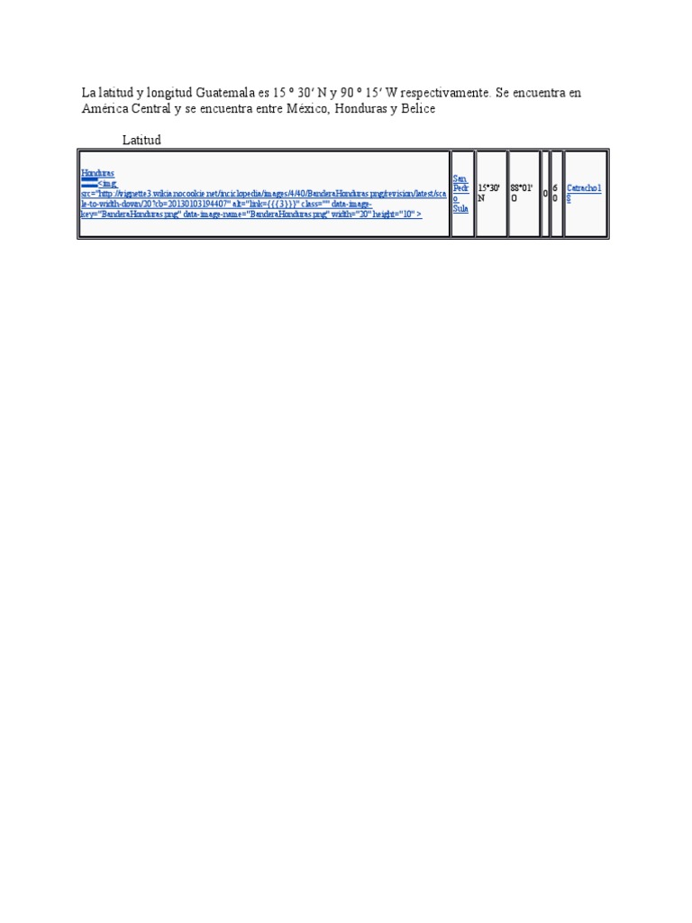 San pedro de sula,la ceia, elprogreso, choluteca. La latitud y la longitud de honduras son 15° 00′ n y 86° 30′ de longitud oeste, respectivamente. La latitud y la longitud son líneas imaginarias dibujadas en mapas para ubicar fácilmente lugares en la tierra. Escribe las coordenadas de latitud antes que las de longitud. Se expresa en grados y cada grado tiene 60 minutos y en cada minuto hay 60 segundos.